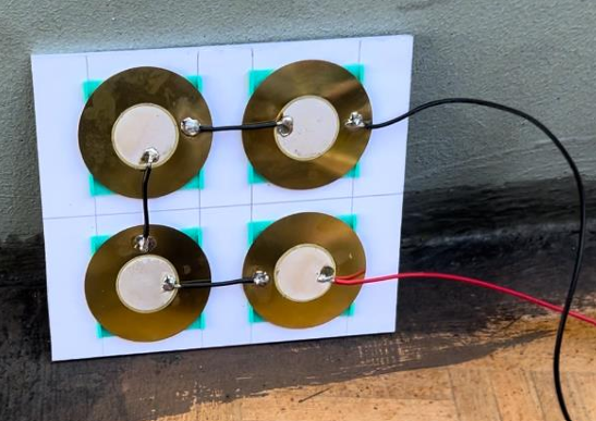 After several trials with wire connections, it was decided to use a series-parallel connection as it provides a more consistent output. Then, a glue gun was used to assemble the piezo and 3D base structure to the foam board, then connected all piezo through soldering.